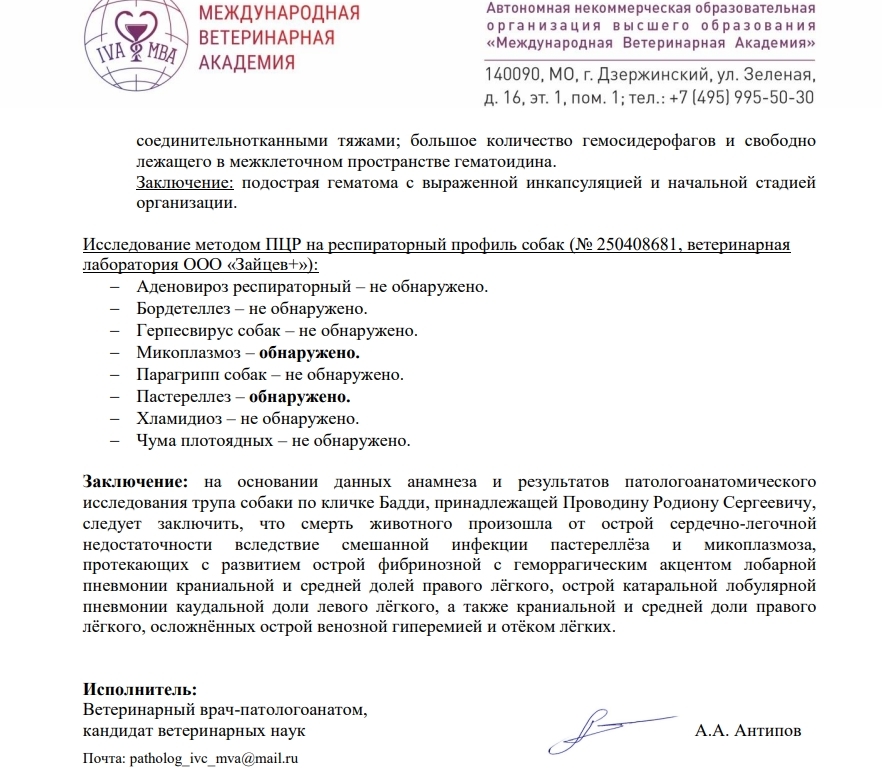 Руководствуясь заключением патологоанатома, который делал вскрытие умершей собаки: смерть животного (собаки по кличке «Бадди») произошла от острой сердечно-легочной недостаточности вследствие смешанной инфекции пастереллёза и микоплазмоза, то есть от той болезни, которой не было, когда Проводин Р.С. сдавал своих собак. Вторая выжившая собака также заразилась данными заболеваниями, но ее успели спасти.